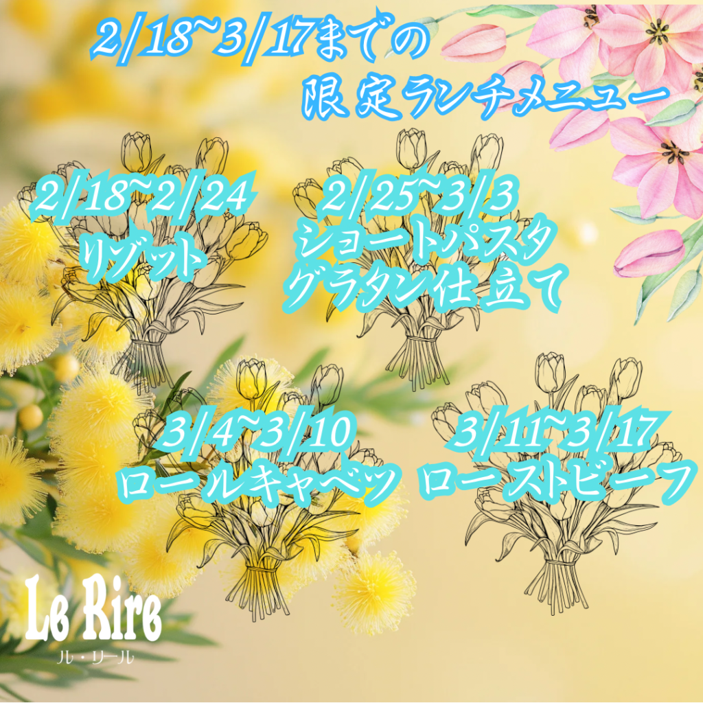 お知らせ 2/18〜3/17までの数量限定メニューランチ こんばんは.‼千駄ヶ谷レストランLe Rireです。来週2/18(水)〜3/17(火)まで数量限定ランチメニューの紹介です。 2月18日(水)〜2月24日(火)リゾット 2月25日(水)〜3月3日(火)ショートパスタグラ... 2026.2.14 詳細はこちら