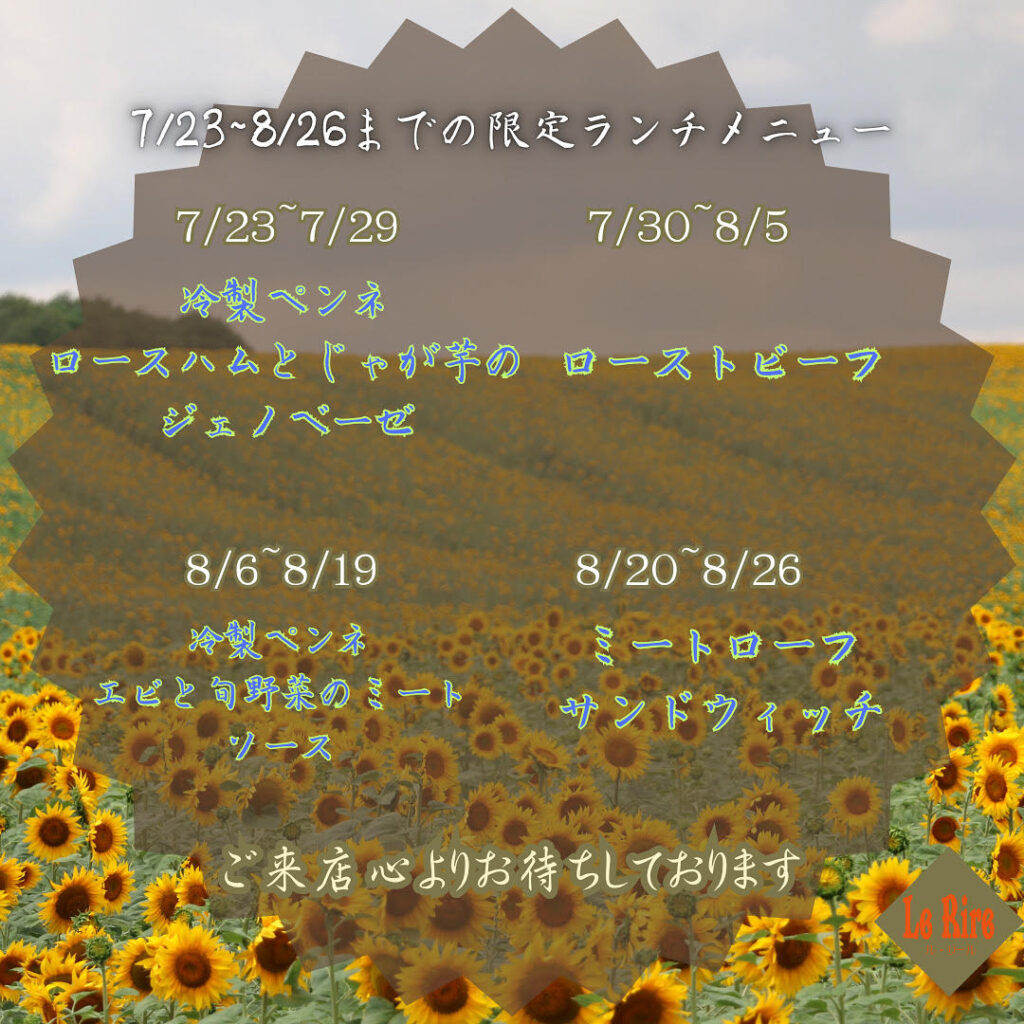 本日は投稿が遅くなりましたが7月23日~8月26日までの限定ランチメニューの献立と8月定休日のお知らせです。