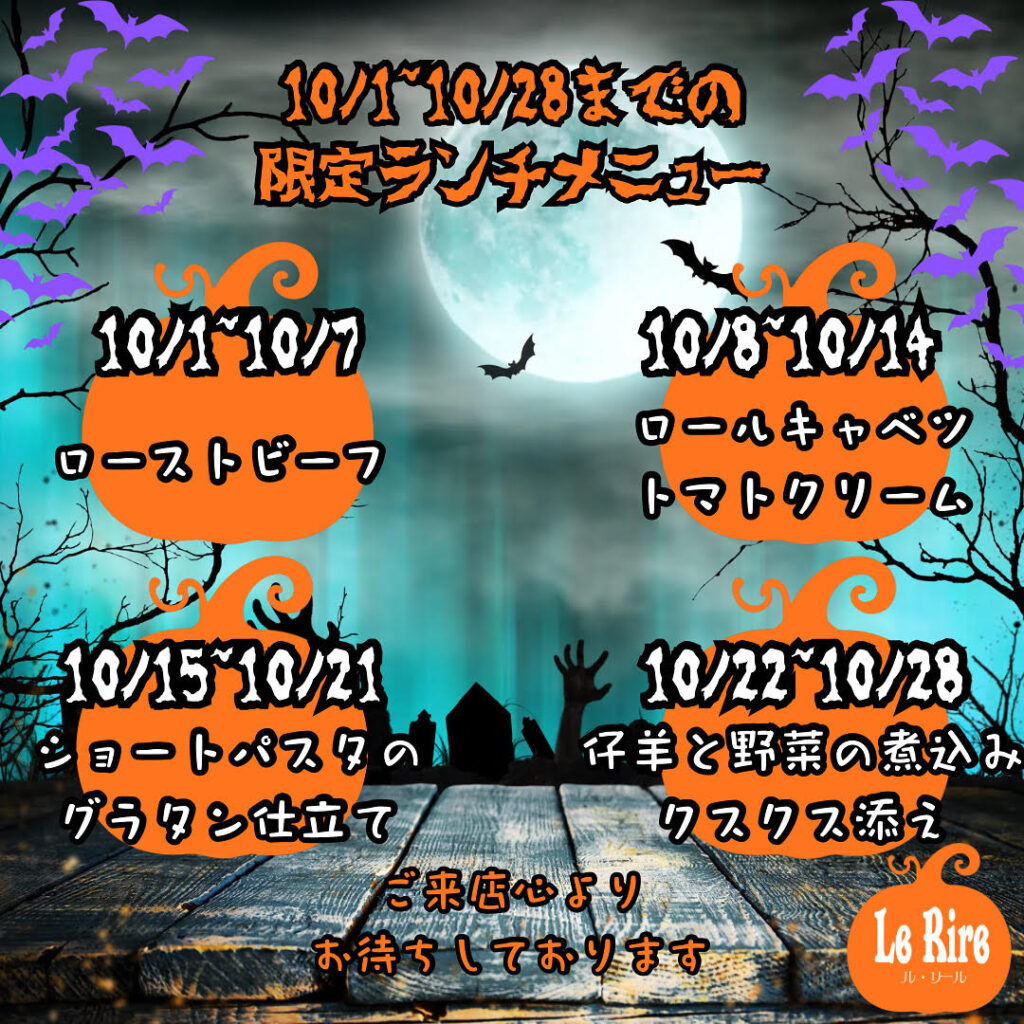お知らせ 10月1日~10月28日までの限定メニュー献立 こんばんは!!千駄ヶ谷洋食屋Le Rireです。少し早いですが、10月1日~10月28日までの限定ランチメニューの献立です!!10月1日〜10月7日ローストビーフ10月8日〜10月14日ロールキャベツトマトクリーム煮10... 2025.9.28 詳細はこちら