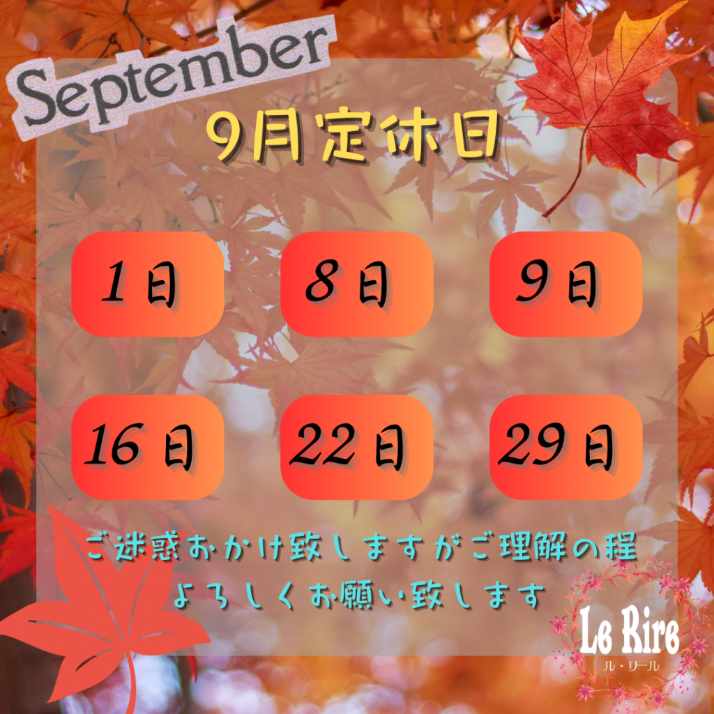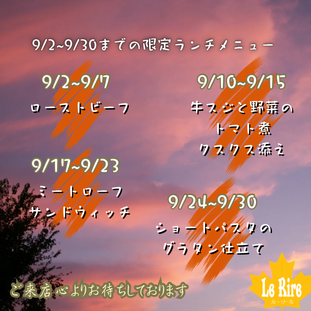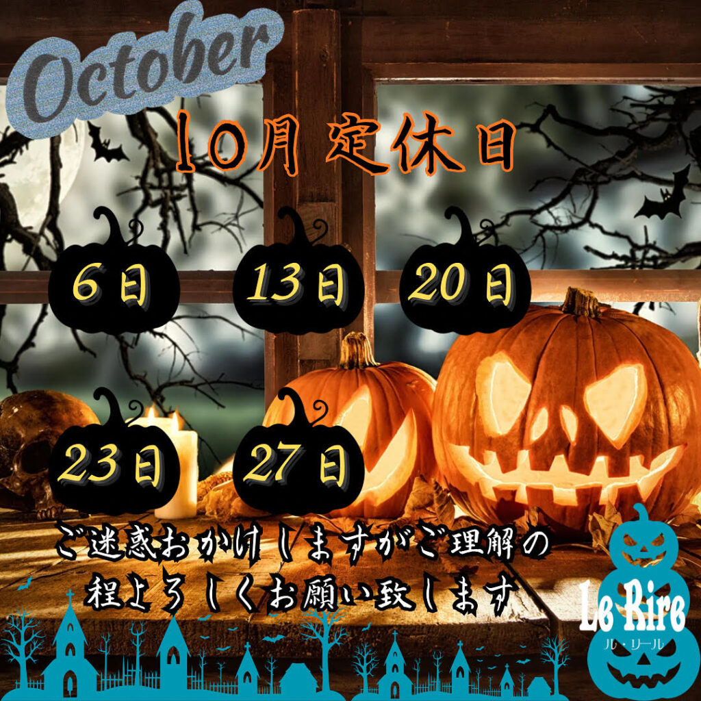 お知らせ 10月定休日 こんばんは、レストランLe Rireです。明日から10月になるので本日は10月定休日のお知らせです・10月6日・10月13日・10月20日・10月23日(木曜日)・10月27日 上記の日が定休日となります。ご迷惑おかけ致... 2025.9.30 詳細はこちら