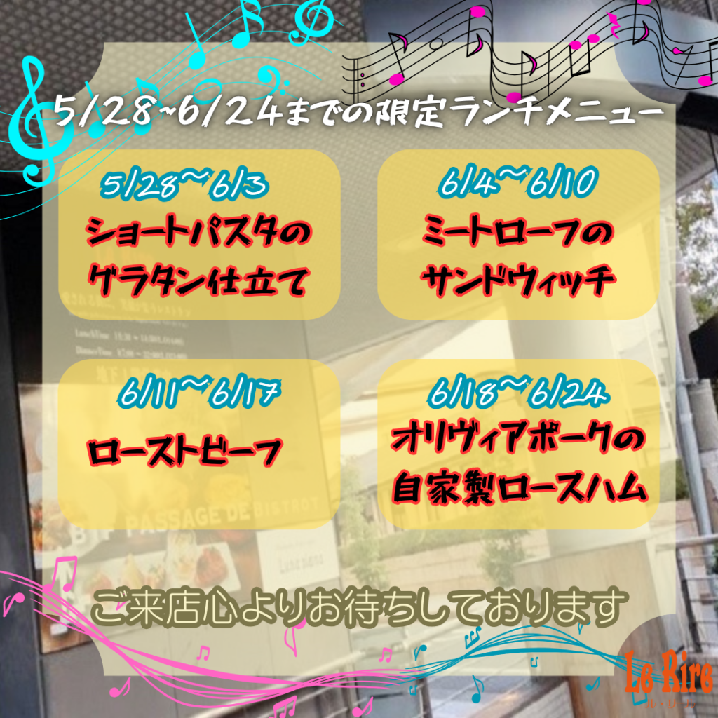 お知らせ 今週の限定ランチメニュー 5/28~6/24までの限定ランチメニュー献立 こんばんは。千駄ヶ谷洋食屋Le Rireです 少し早いですが来週からの限定ランチメニューの献立です!! 5月28日〜6月3日 ショートパスタの グラタン仕立て 6月4日〜6月10日 ミートローフの サンドウィッチ6月11... 2025.5.22 詳細はこちら