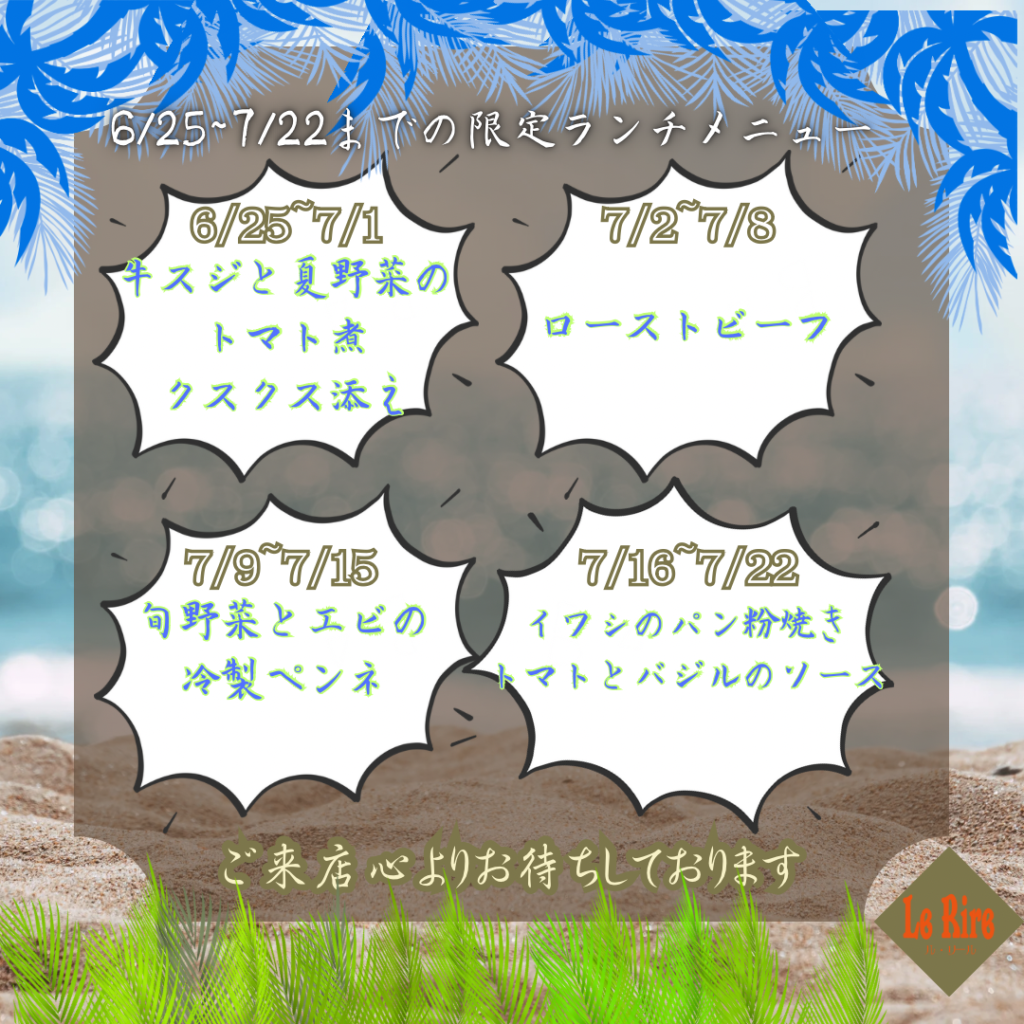 お知らせ 6月25日~7月22日までの数量限定メニュー献立 こんばんは!!千駄ヶ谷洋食屋Le Rireです。 明日6月25日~7月22日までの限定ランチメニューの献立です!! 今回はなんと2品も新しいメニューがございます!! 6月25日〜7月1日 牛スジと夏野菜の トマト煮込みク... 2025.6.24 詳細はこちら