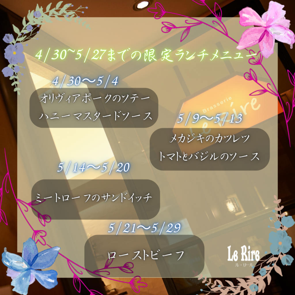 お知らせ 4/30~5/29までの限定ランチメニュー献立 こんばんは、千駄ヶ谷洋食屋Le Rireです!! 今月からの限定ランチメニューの献立です!! 4月30日〜5月4日オリヴィアポークのソテーハニーマスタードソース5月9日〜5月13日メカジキのカツレツトマトとバジルのソース... 2025.5.2 詳細はこちら